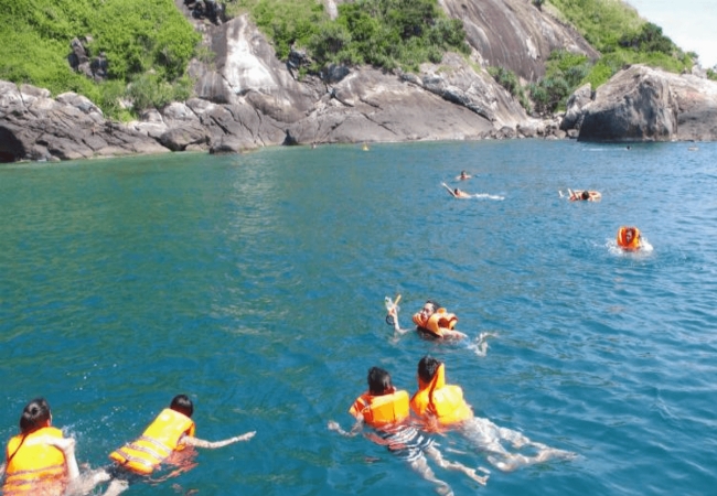 Hoạt động tắm biển tại bãi Bụt có điểm đặc biệt là màu nước biển thay đổi theo thời gian trong ngày. Buổi sáng và trưa, biển có màu xanh biếc trong vắt. Đến chiều tà, nước biển chuyển sang sắc xanh lục huyền ảo. Cát trắng phau, nước trong xanh mang lại cảm giác bình yên, thư thái tuyệt vời.