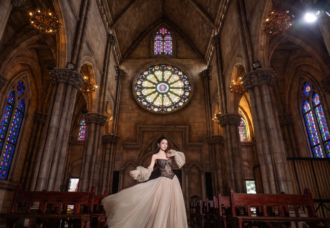 Nhà thờ St. Denis với kiến trúc Gothic tráng lệ. Bậc thang rộng phía trước là nơi biểu diễn lý tưởng. Phông nền là mặt tiền nhà thờ với cửa kính màu. Sự trang trọng của kiến trúc tôn lên vẻ đẹp nghệ thuật.