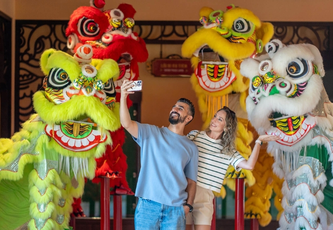 Lân sư rồng múa theo điệu trống vang. Đèn ông sao rước quanh làng Pháp tạo khung cảnh ấm áp. Trống cơm và các trò chơi xưa được tổ chức từ 10h-15h tại Du Dome.